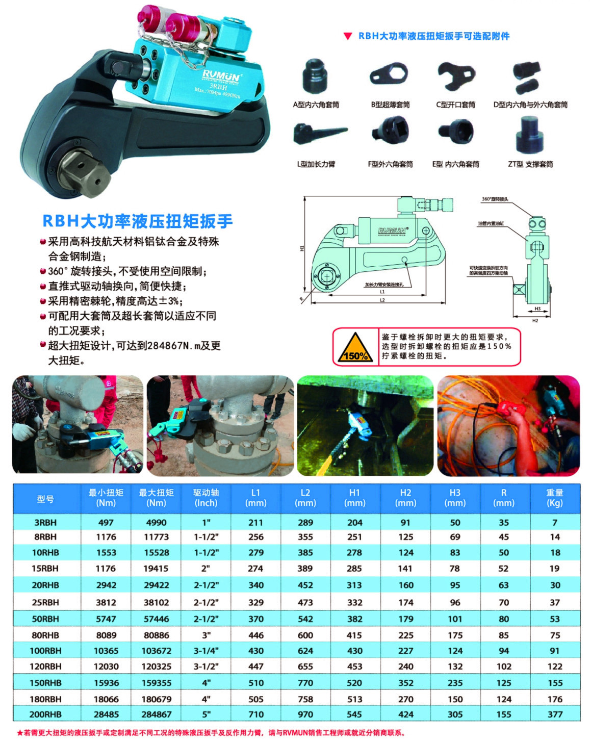 ★若需要更大扭矩的液壓扳手或定制滿足不同工況的特殊液壓扳手請與RVMUN銷售工程師或就近分銷商聯(lián)系